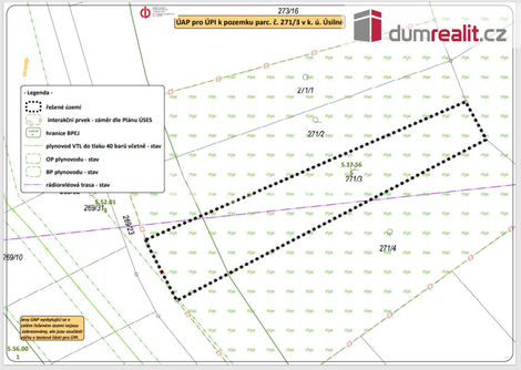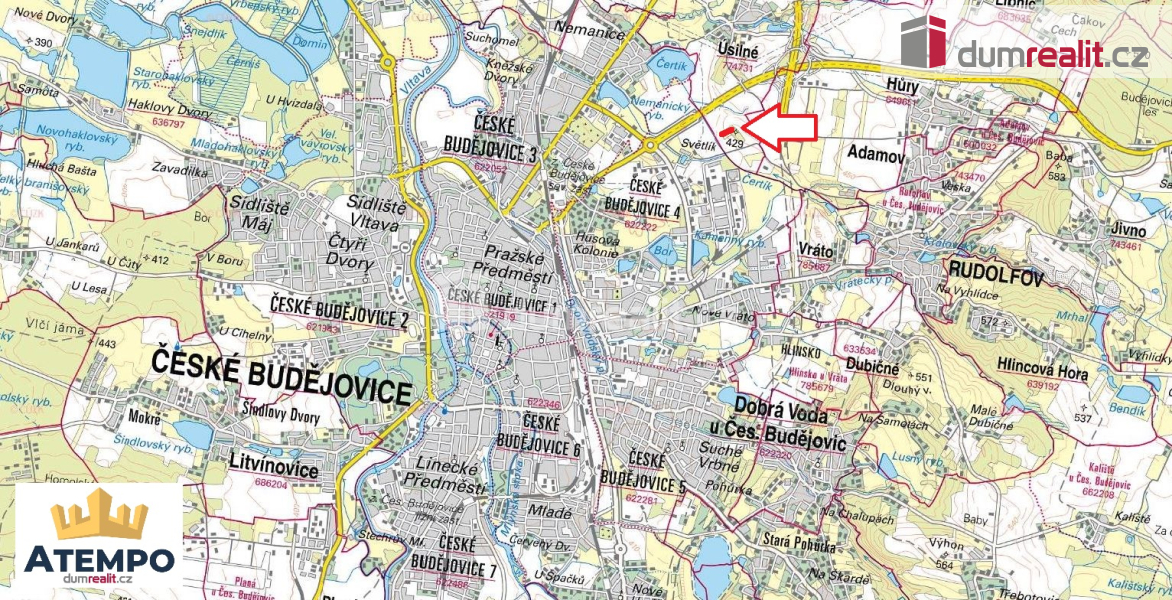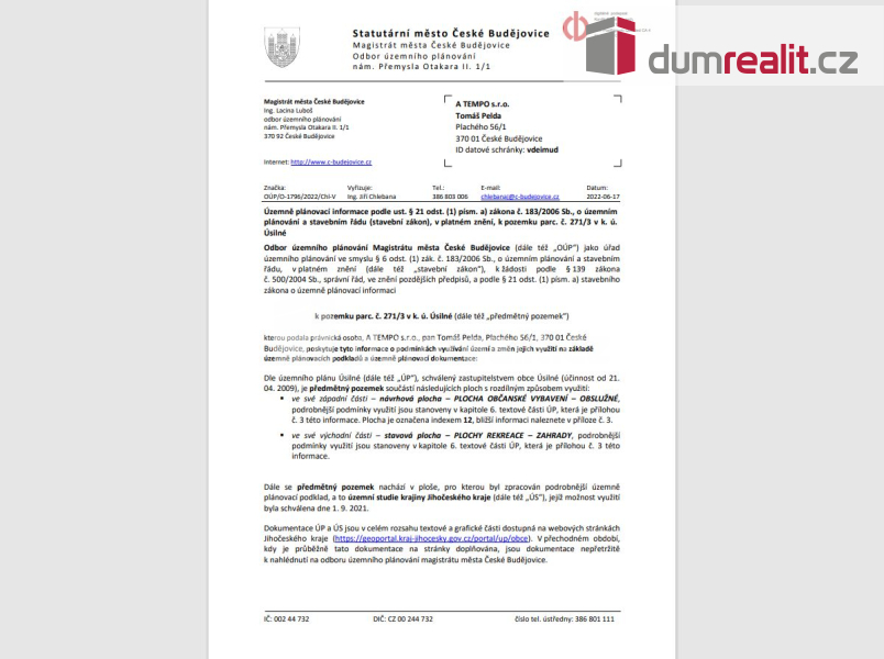 Dumrealit.cz Vám zprostředkuje prodej stavebního pozemku o rozloze 1.632 m2 v Úsilném ve městě České Budějovice. Prodávaný pozemek par. číslo 271/3 v kú Úsilné je dle Územního plánu města České Budějovice vedený z 1/2 jako plocha občanského vybavení a z 2/2 je pozemek veden k rekreaci. U hranice pozemku vede elektřina, po smluvním ujednání s E.gd možnost parcelu napojit na distribuční síť. Ve vzdálenosti cca 400 m vede plyn, vodovod a kanalizace. Pozemek lze s menšími úpravami využít k rekreaci (zahrada). K pozemku se dostaneme po obecní prašné komunikaci. Doporučuji prohlídku, pozemek se nachází cca 10 minut od centra města České Budějovice. K dispozici máme kompletní zákres inženýrských sítí, Územně plánovací informaci s možnostmi výstavby a využití pozemku. Možnost koupě i 2 pozemku vyznačeného oranžově na fotografiích, par. č. 269/4 zapsané na LV 167 v k.ú. Úsilné. Více informací Vám poskytne realitní makléř Tomáš Pelda z realitní kanceláře A TEMPO fungující pod ochrannou známkou dumrealit.cz. Ev. číslo: 654875. Energetický štítek: G